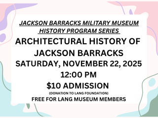 Join staff member and Grand Canyon adjunct instructor, Donna Mann, for an interactive walk through the historic 1835 garrison and learn about the unique architectural history of Jackson Barracks. $10 donation requested. Can be made in advance by visiting https://donorbox.org/events/815319