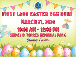 Come join the fun at the First Lady Easter Egg Hunt from 10:00am-12:00pm at Sidney D. Torres Memorial Park on March 21, 2026! Children ages 10 and under will enjoy a day filled with activities ranging from a traditional Easter egg hunt, to an Easter Bunny picture station, train rides, inflatables, music, refreshments, and more!