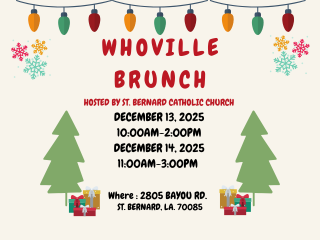 Join us for St. Bernard Catholic Church's Grinchmas in Whoville Brunch at the St. Bernard Catholic Church(2805 Bayou Rd.) on December 13th from 10:00am-2:00pm and December 14th from 11:00am-3:00pm. The breakfast is $20.00 for the full Whoville Experience which will include Martha May's Scrambled Eggs, Beast Bacon, Max's Crispy Chicken & Waffles, Cindy Lou's (Shrimp & Grits), Grinchmas Pancakes, Grinch Kabobs, Whoville Feast Treats, Grinch Cakes, Grinch Hearts, Grinch Fluff, Beezlenut Splash (Punch), Who Brew (Hot Chocolate & Coffee).